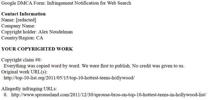 In other words: Alex Noudelman steals work from other writers, then sends legal complaints to Google because his work was “copied without permission.” To be fair, it doesn’t look like he’s complaining about the same articles in the above links – as far as I can tell, Alex Noudelman is the legitimate author of “Top 10 Hottest Teens in Hollywood.”